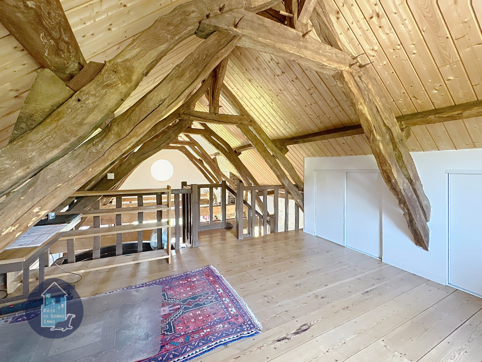 À l’étage, vous profiterez d’une chambre ouverte, bénéficiant d’une vue plongeante sur le salon. Cet espace mezzanine apporte un charme supplémentaire à l’ensemble et crée une atmosphère cosy idéale pour un coin nuit.