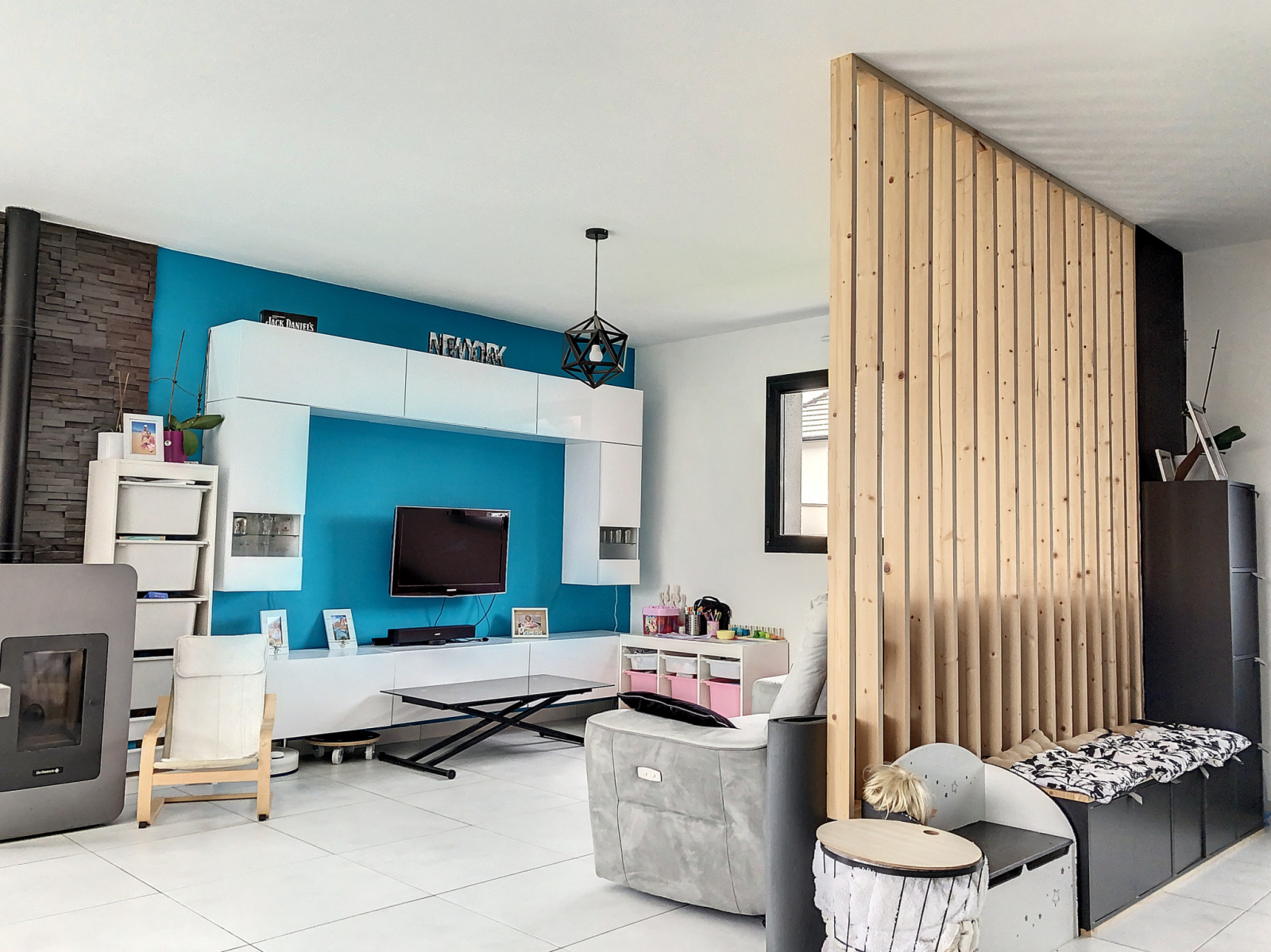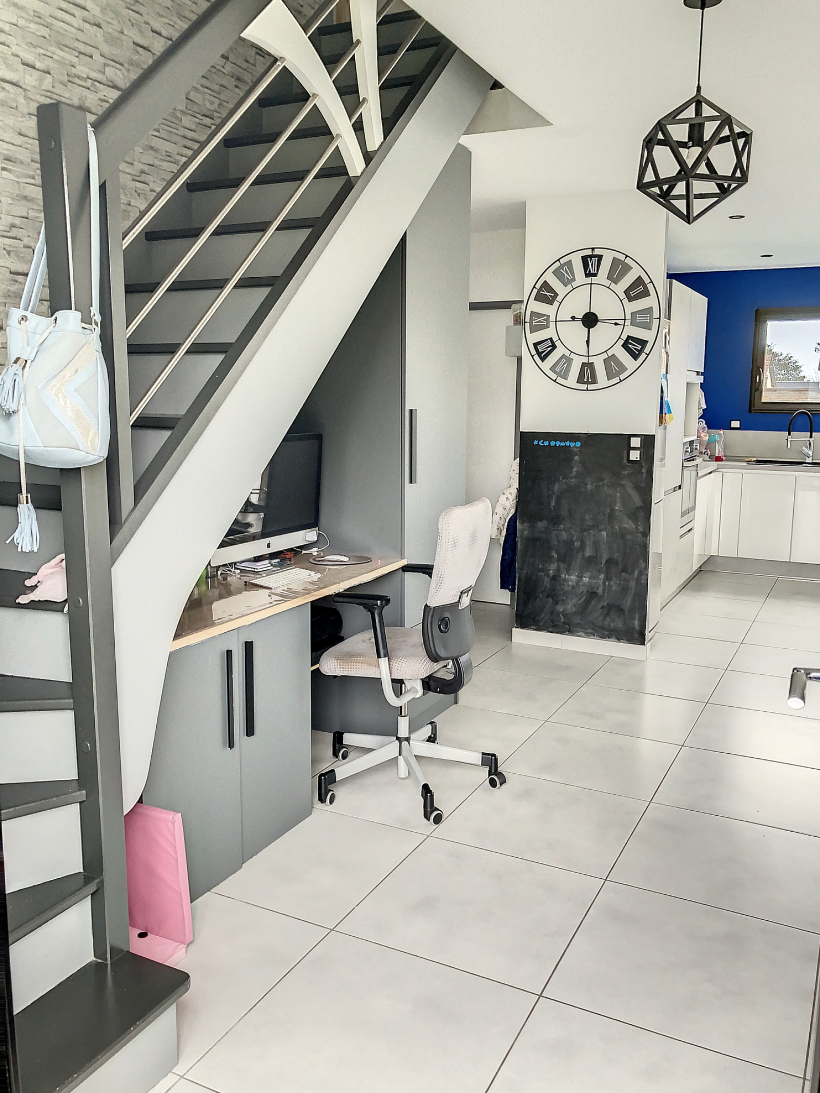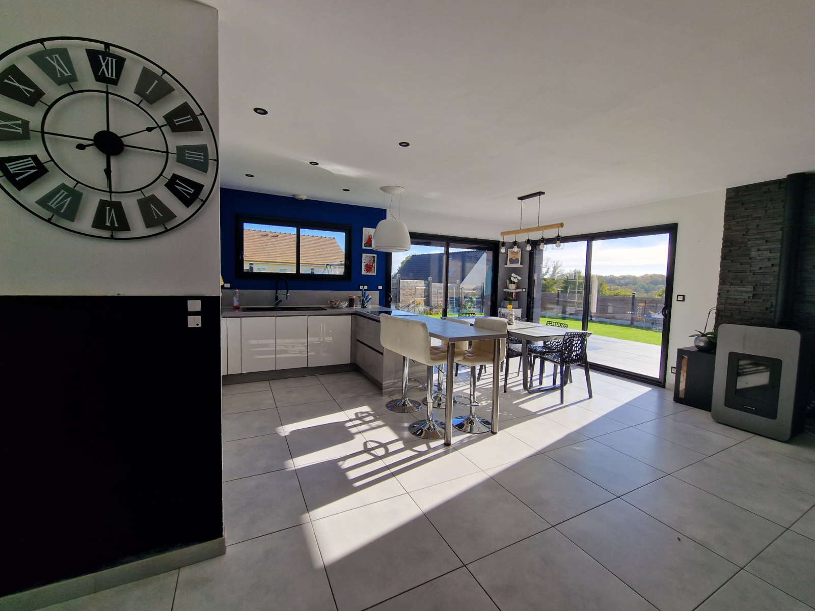 au rez de chaussée: entrée avec espace bureau, un séjour spacieux et lumineux, avec poêle à granulé et vue sur le jardin,