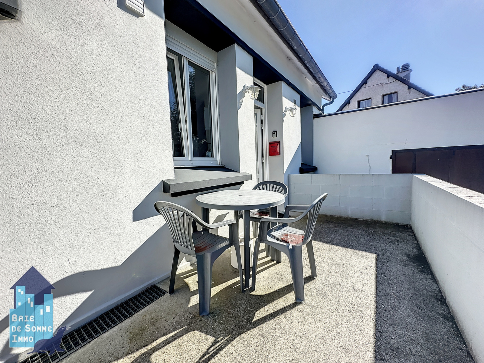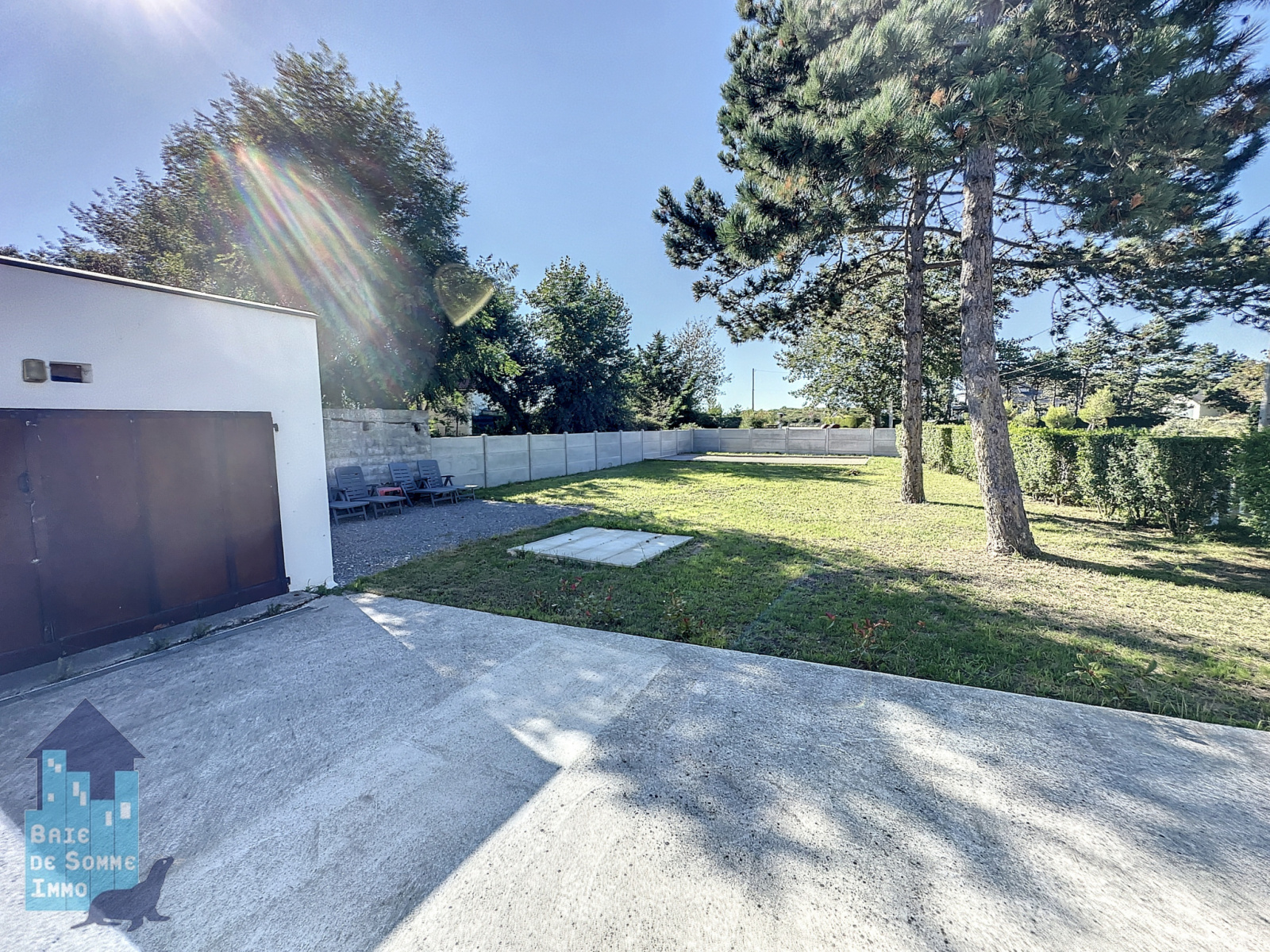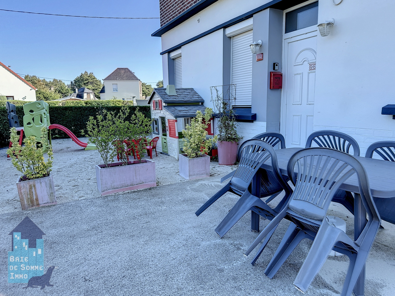 Le terrain entièrement clos et sécurisé offre un espace extérieur idéal pour les enfants. Vous trouverez également un jardin en pelouse avec un boulodrome, parfait pour les moments de détente en famille ou entre amis. De plus, un garage est disponible, offrant la possibilité de créer un quatrième logement.